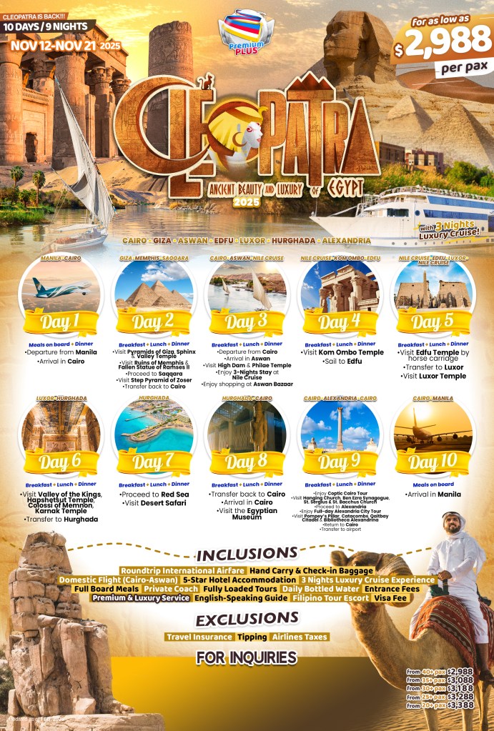 10d/9n CLEOPATRA (Ancient Beauty and Luxury of EGYPT) 2025 If you are interested to join this tour, please fill in your details below: Go backThank you for your interest! A member of our team will get in touch with you. Name:(required) Warning Email Address:(required) Warning Mobile Number:(required) Warning Warning. SendSubmitting form Δ