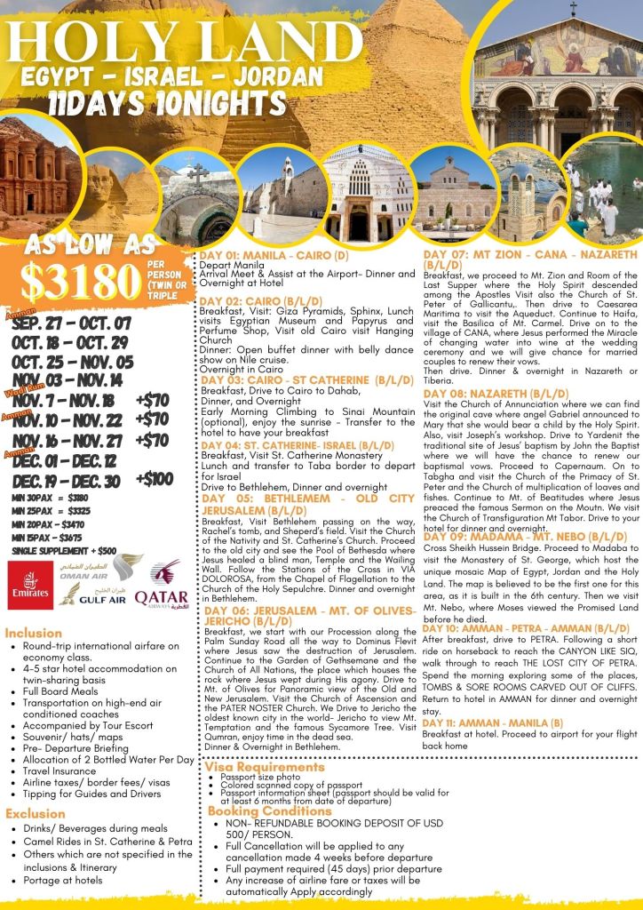 11d/10n A HOLYLAND TOUR 2025 If you are interested to join this tour, please fill in your details below: Go backThank you for your interest! A member of our team will get in touch with you. Name:(required) Warning Email Address:(required) Warning Mobile Number:(required) Warning Warning. SendSubmitting form Δ