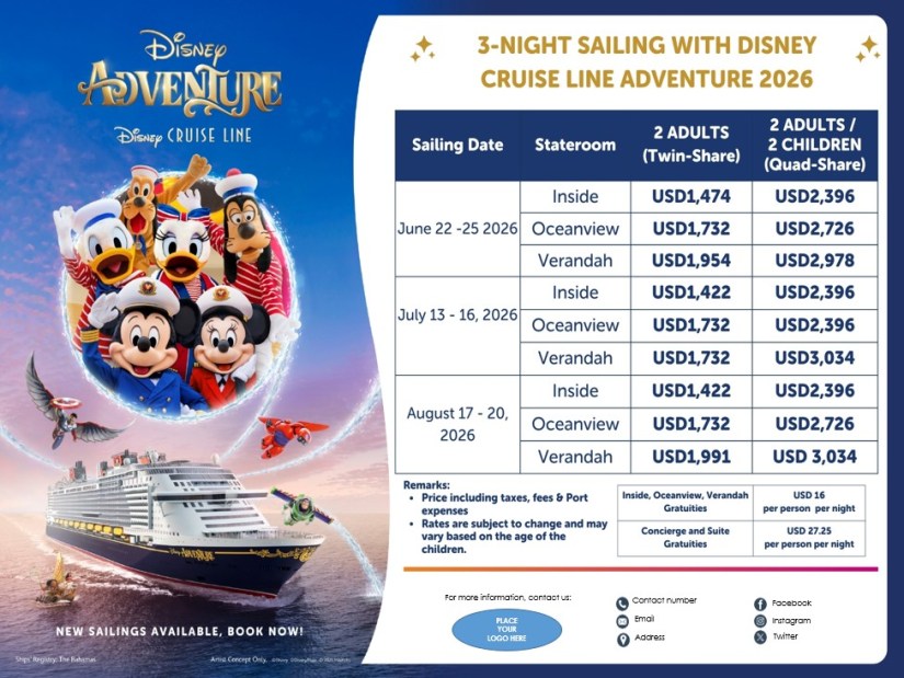3-NIGHT SAILING WITH DISNEY CRUISE LINE ADVENTURE 2026 |JUL-AUG| If you are interested to join this tour, please fill in your details below: Go backThank you for your interest! A member of our team will get in touch with you. Name(required) Warning Email Address(required) Warning Mobile Number(required) Warning Warning. SendSubmitting form Δ