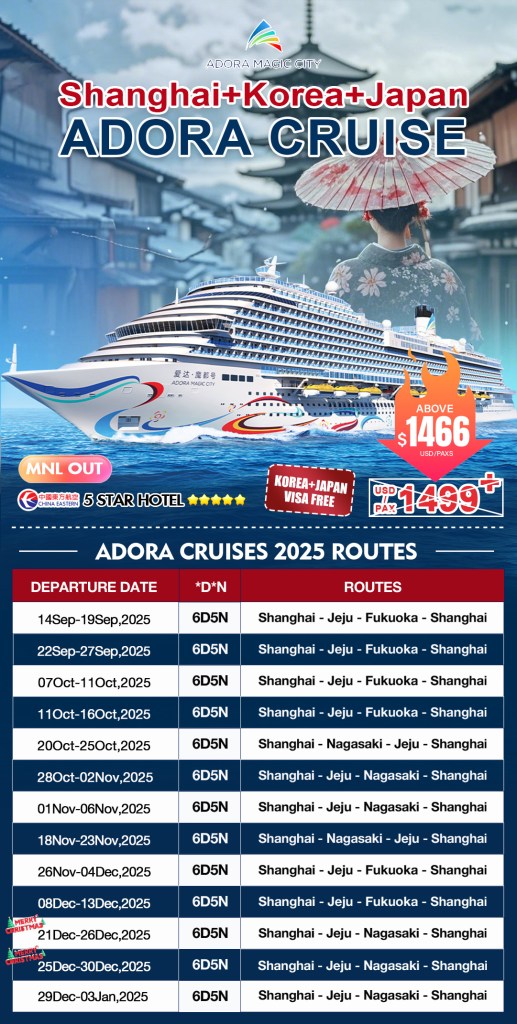 6d/5n ADORA CRUISE 2025 (SHANGHAI + KOREA + JAPAN) If you are interested to join this tour, please fill in your details below: Go backThank you for your interest! A member of our team will get in touch with you. Name:(required) Warning Email Address:(required) Warning Mobile Number:(required) Warning Warning. SendSubmitting form Δ