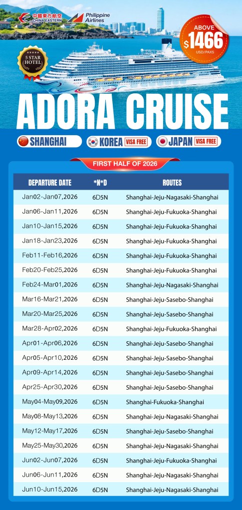 6d/5n ADORA CRUISE (SHANGHAI-KOREA-JAPAN) JAN-JUN 2026 If you are interested to join this tour, please fill in your details below: Go backThank you for your interest! A member of our team will get in touch with you. Name(required) Warning Email Address(required) Warning Mobile Number(required) Warning Warning. SendSubmitting form Δ