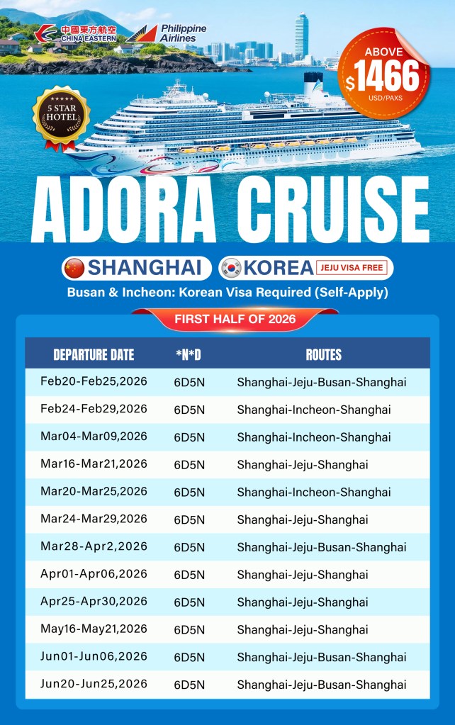 6d/5n ADORA CRUISE (SHANGHAI-KOREA) FEB-JUN 2026 If you are interested to join this tour, please fill in your details below: ← BackThank you for your interest! A member of our team will get in touch with you. Name(required) Email Address(required) Mobile Number(required) SendSubmitting form Δ