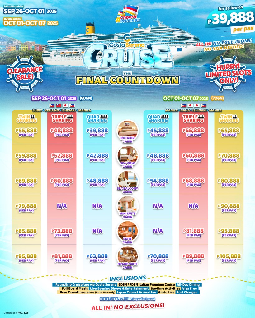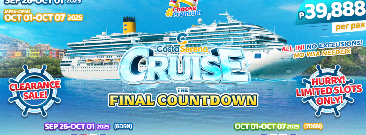 6d/5n COSTA SERENA CRUISE FINAL COUNTDOWN TOUR 2025!!! If you are interested to join this tour, please fill in your details below: Go backThank you for your interest! A member of our team will get in touch with you. Name(required) Warning Email Address(required) Warning Mobile Number(required) Warning Warning. SendSubmitting form Δ