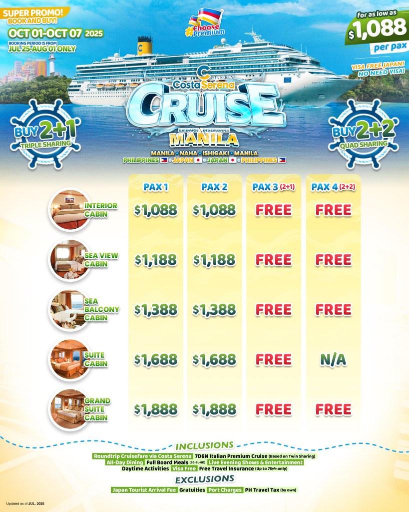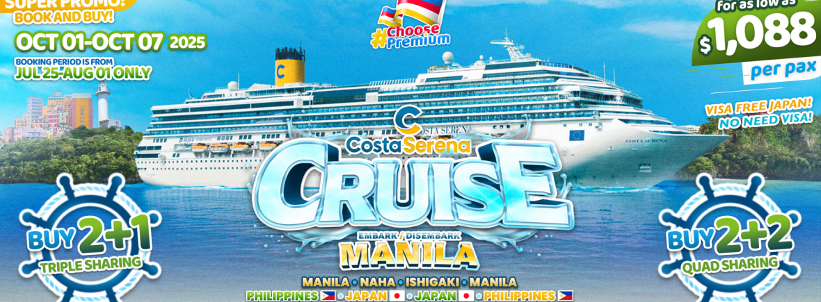6d/5n COSTA SERENA CRUISE MANILA TOUR (Manila-Naha-Ishigaki-Manila) OCT 2025 If you are interested to join this tour, please fill in your details below: Go backThank you for your interest! A member of our team will get in touch with you. Name(required) Warning Email Address(required) Warning Mobile Number(required) Warning Warning. SendSubmitting form Δ