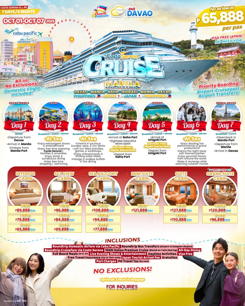 7d/6n COSTA SERENA ALL-IN 2025 DAVAO-MANILA0-JAPAN-MANILA If you are interested to join this tour, please fill in your details below: Go backThank you for your interest! A member of our team will get in touch with you. Name(required) Warning Email Address(required) Warning Mobile Number(required) Warning Warning. SendSubmitting form Δ