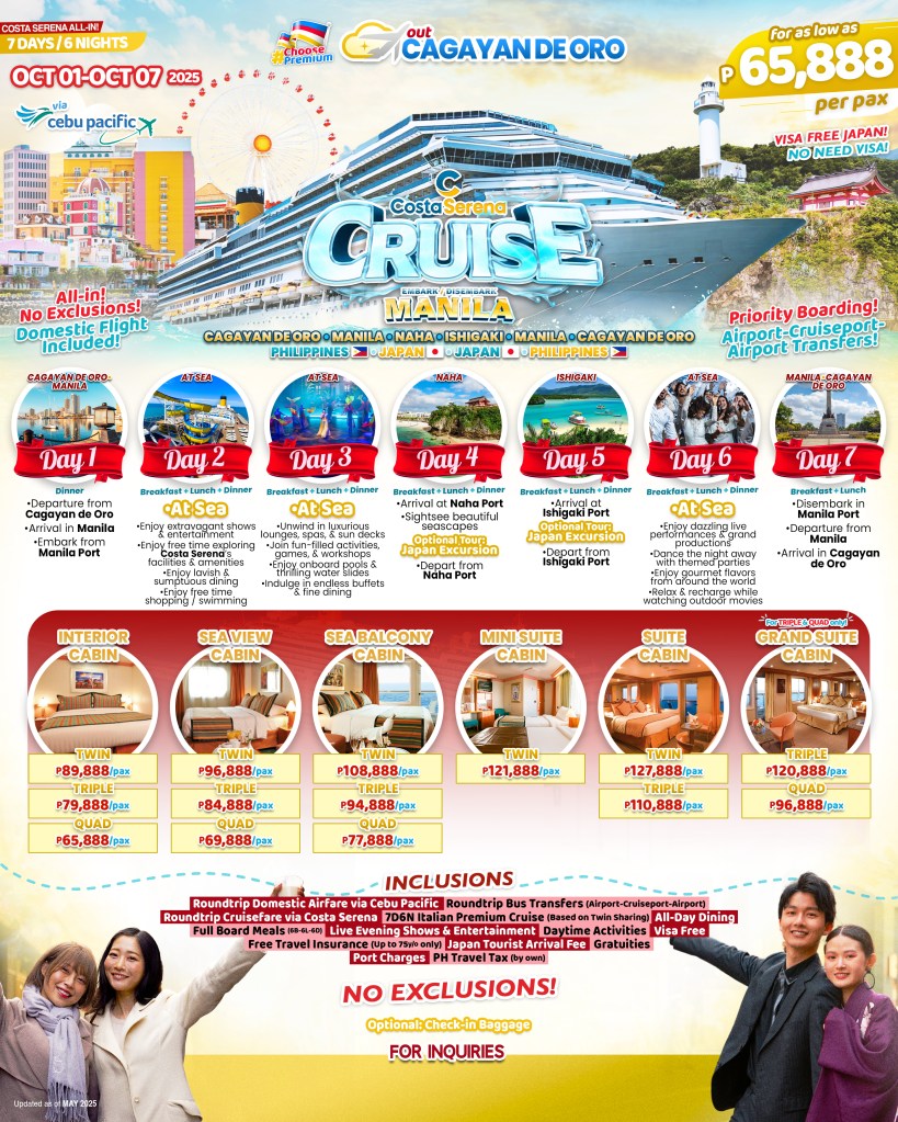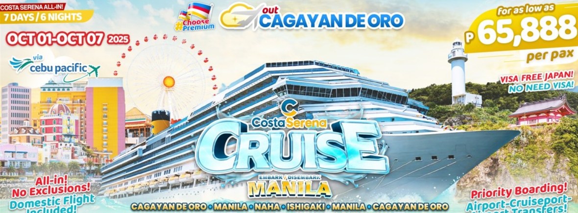 7d/6n COSTA SERENA ALL-IN CAGAYAN DE ORO 2025!! CAGAYAN DE ORO-MANILA-CAGAYAN DE ORO If you are interested to join this tour, please fill in your details below: Go backThank you for your interest! A member of our team will get in touch with you. Name:(required) Warning Email Address:(required) Warning Mobile Number:(required) Warning Warning. SendSubmitting form Δ
