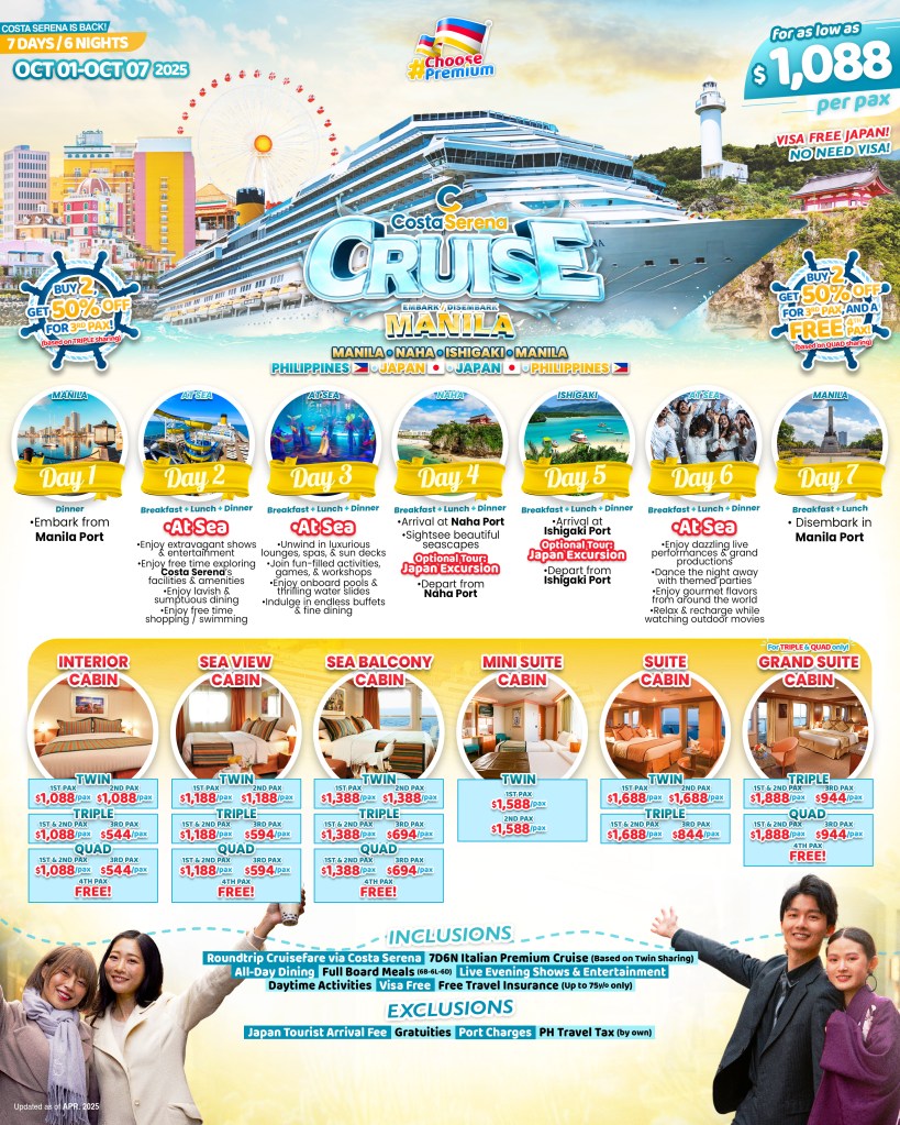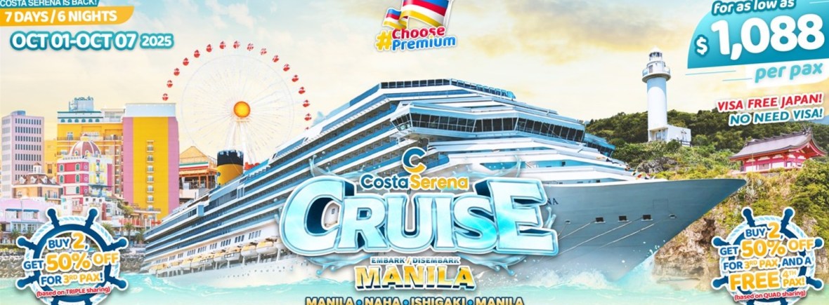7d/6n COSTA SERENA IS BACK!! – MANILA – JAPAN 2025 If you are interested to join this tour, please fill in your details below: ← BackThank you for your interest! A member of our team will get in touch with you. Name:(required) Email Address:(required) Mobile Number:(required) SendSubmitting form Δ