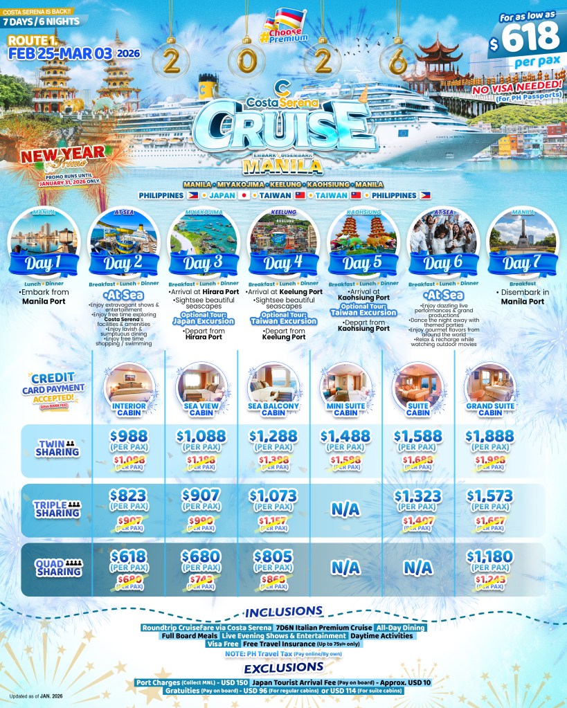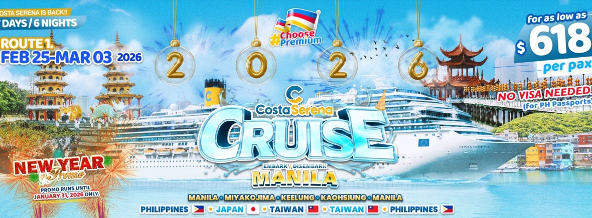 7d/6n COSTA SERENA CRUISE MANILA NEW YEAR PROMO 2026 (Route 1) If you are interested to join this tour, please fill in your details below: ← BackThank you for your interest! A member of our team will get in touch with you. Name(required) Email Address(required) Mobile Number(required) SendSubmitting form Δ