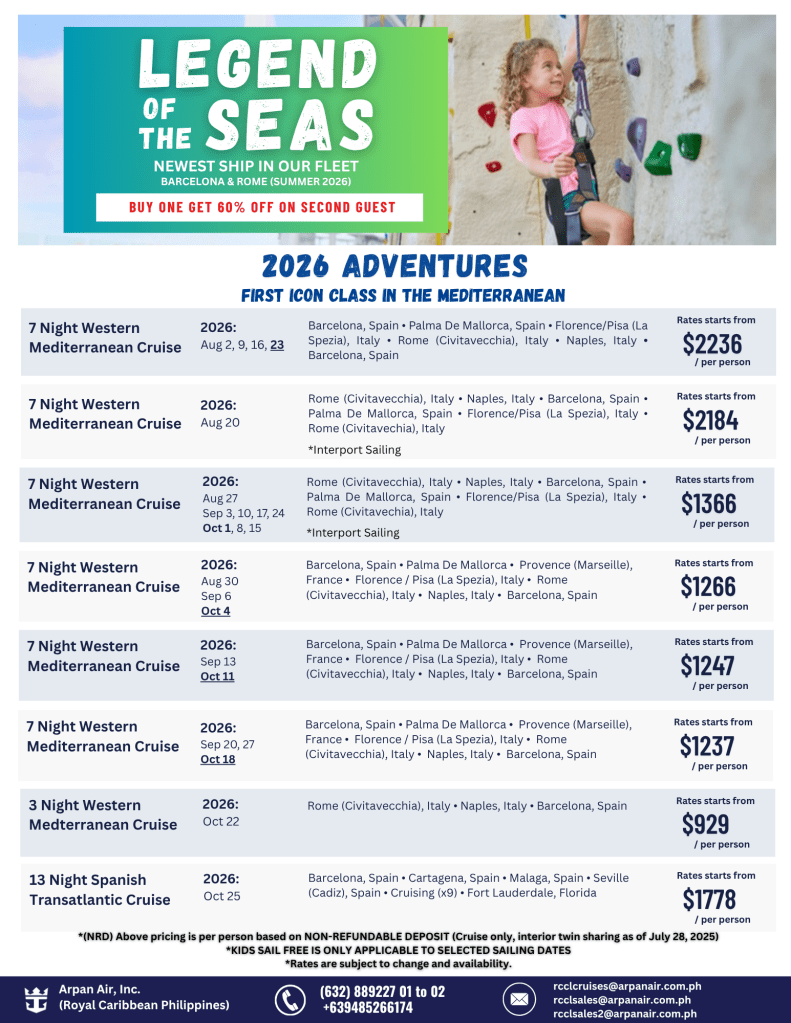 LEGEND OF THE SEAS BARCELONA & ROME (SUMMER 2026 ADVENTURES) If you are interested to join this tour, please fill in your details below: Go backThank you for your interest! A member of our team will get in touch with you. Name:(required) Warning Email Address:(required) Warning Mobile Number:(required) Warning Warning. SendSubmitting form Δ