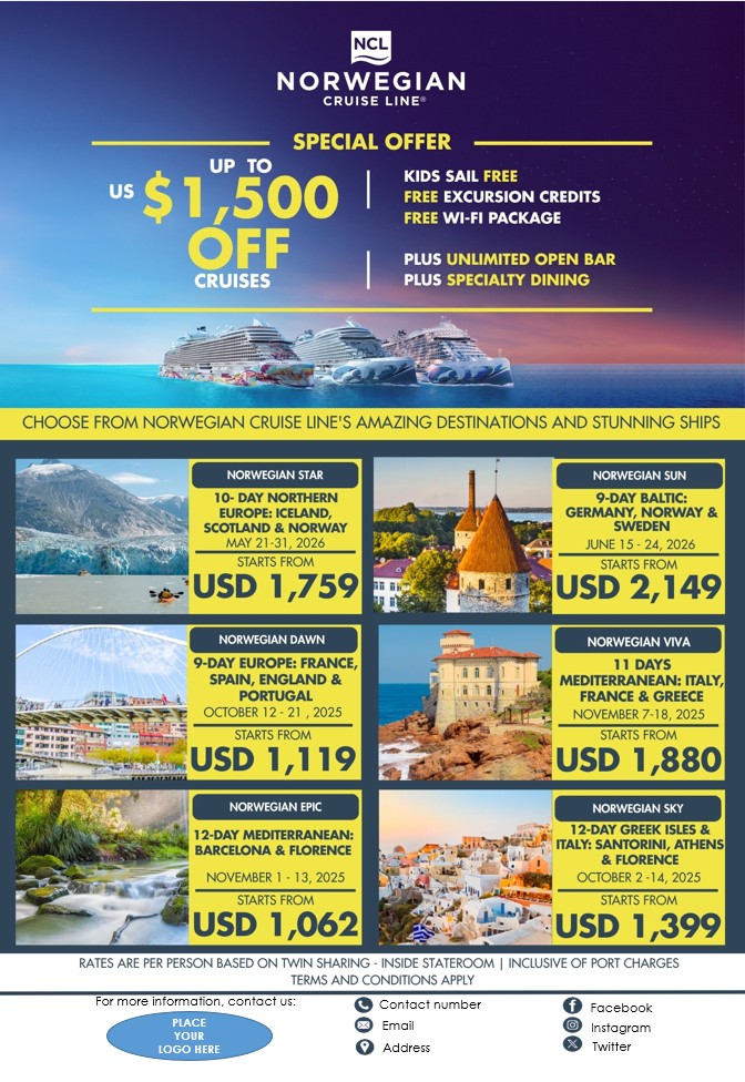 NORWEGIAN CRUISE LINE’S AMAZING DESTINATIONS AND STUNNING SHIPS 2025 – 2026 If you are interested to join this tour, please fill in your details below: Go backThank you for your interest! A member of our team will get in touch with you. Name:(required) Warning Email Address:(required) Warning Mobile Number:(required) Warning Warning. SendSubmitting form Δ