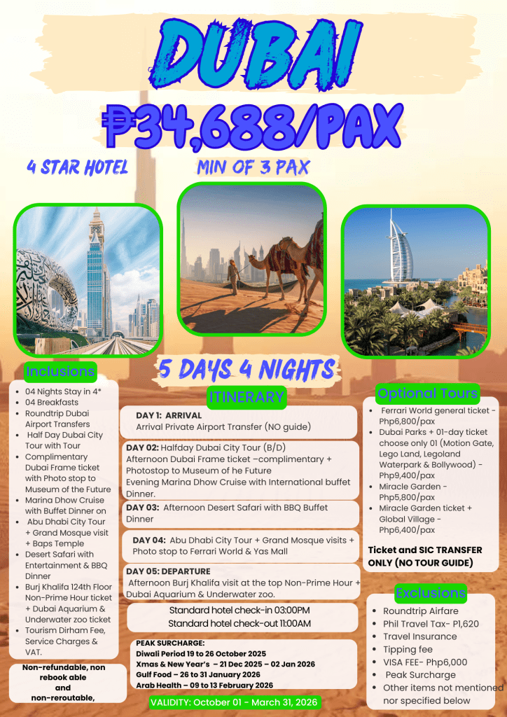 5d/4n DUBAI TOUR 2025-2026 (OCT-DEC) If you are interested to join this tour, please fill in your details below: ← BackThank you for your interest! A member of our team will get in touch with you. Name:(required) Email Address:(required) Mobile Number:(required) SendSubmitting form Δ