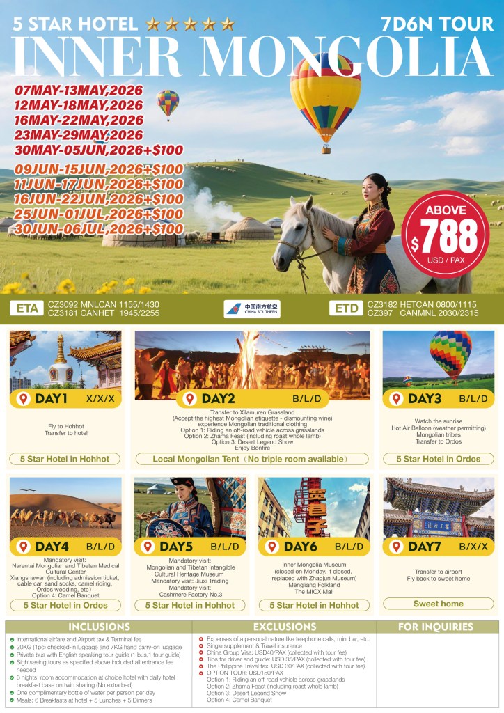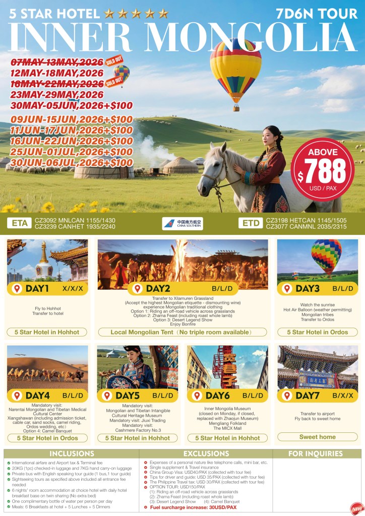 7d/6n INNER MONGOLIA TOUR 2026 If you are interested to join this tour, please fill in your details below: ← BackThank you for your interest! A member of our team will get in touch with you. Name(required) Email Address(required) Mobile Number(required) SendSubmitting form Δ
