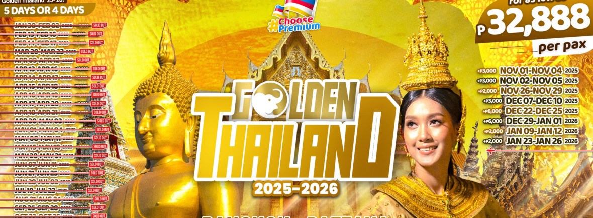 5d or 4d Golden Thailand TOUR 2025-2026 If you are interested to join this tour, please fill in your details below: Go backThank you for your interest! A member of our team will get in touch with you. Name(required) Warning Email Address(required) Warning Mobile Number(required) Warning Warning. SendSubmitting form Δ