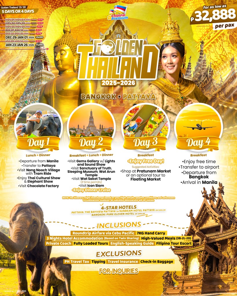 5d or 4d Golden Thailand TOUR 2025-2026 If you are interested to join this tour, please fill in your details below: ← BackThank you for your interest! A member of our team will get in touch with you. Name(required) Email Address(required) Mobile Number(required) SendSubmitting form Δ