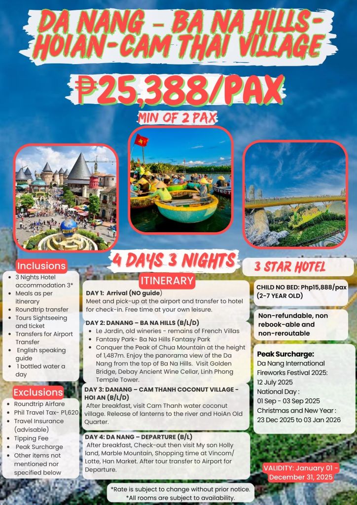4d/3n DANANG – BA NA HILLS – HOIAN – CAM THAI VILLAGE TOUR 2025 EPSON MFP image If you are interested to join this tour, please fill in your details below: Go backThank you for your interest! A member of our team will get in touch with you. Name:(required) Warning Email Address:(required) Warning Mobile Number:(required) Warning Warning. SendSubmitting form Δ