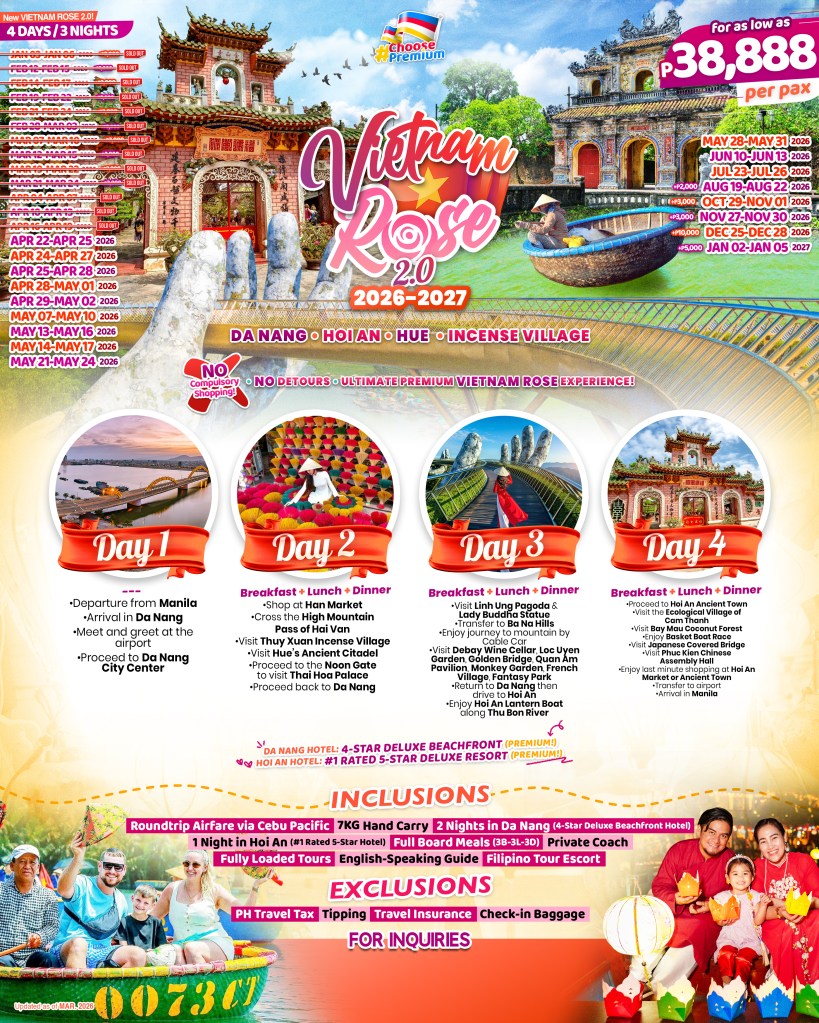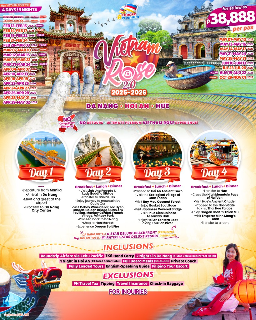 4d/3n Vietnam Rose 2.0 (Da Nang-Hoi An-Hue) 2026-2027 If you are interested in join this tour, please fill in your details below: ← BackThank you for your interest! A member of our team will get in touch with you. Name(required) e-mail Address(required) Mobile Number(required) SendSubmitting form Δ