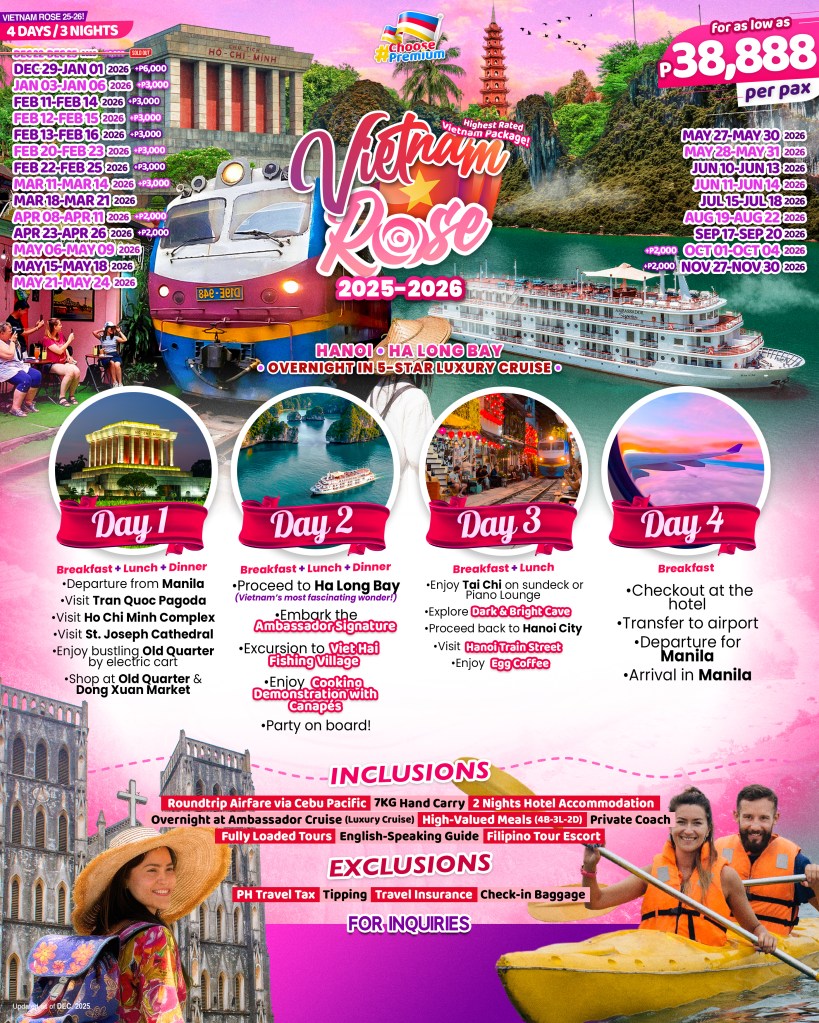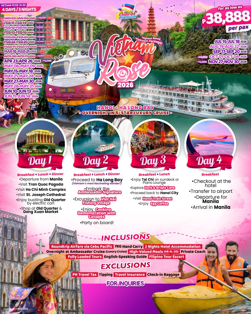4d/3n VIETNAM ROSE 1.0 2025-2026 (HANOI – HA LONG BAY) If you are interested to join this tour, please fill in your details below: ← BackThank you for your interest! A member of our team will get in touch with you. Name(required) Email Address(required) Mobile Number(required) SendSubmitting form Δ