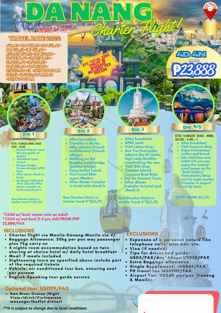 4d/4n DA NANG TOUR CHARTER FLIGHT JUN|JAN 2025-2026 If you are interested to join this tour, please fill in your details below: ← BackThank you for your interest! A member of our team will get in touch with you. Name:(required) Email Address:(required) Mobile Number:(required) SendSubmitting form Δ