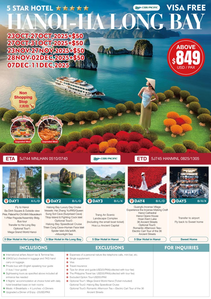 5d/4n HANOI – HALONG BAY TOUR 2025 If you are interested to join this tour, please fill in your details below: ← BackThank you for your interest! A member of our team will get in touch with you. Name:(required) Email Address:(required) Mobile Number:(required) SendSubmitting form Δ