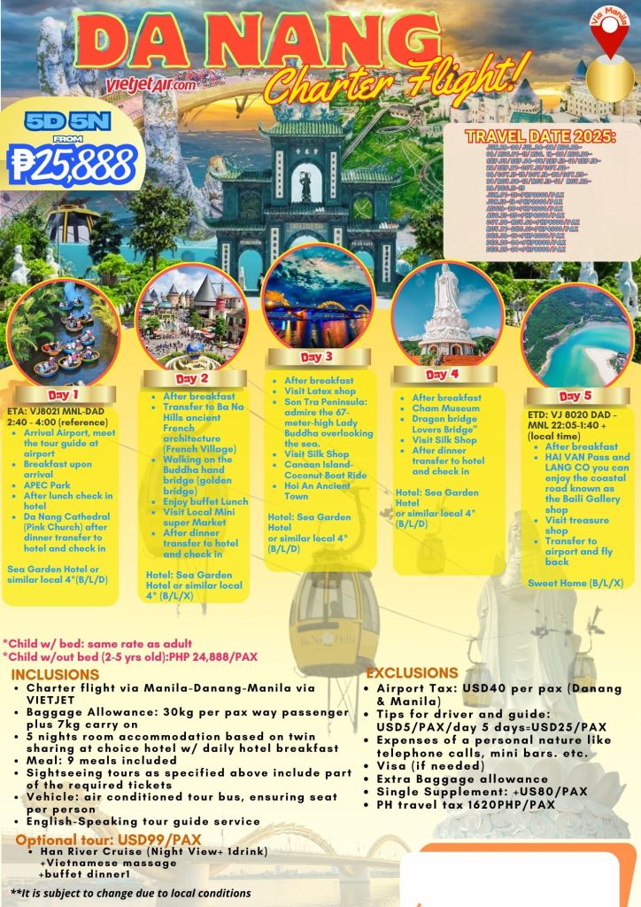 5d/5n DANANG TOUR 2025 CHARTER FLIGHT JUN|DEC 2025 If you are interested to join this tour, please fill in your details below: ← BackThank you for your interest! A member of our team will get in touch with you. Name:(required) Email Address:(required) Mobile Number:(required) SendSubmitting form Δ