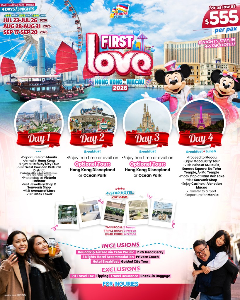 4d/3n FIRST LOVE HONGKONG + MACAU TOUR 2026 If you are interested to join this tour, please fill in your details below: ← BackThank you for your interest! A member of our team will get in touch with you. Name:(required) Email Address:(required) Mobile Number:(required) SendSubmitting form Δ