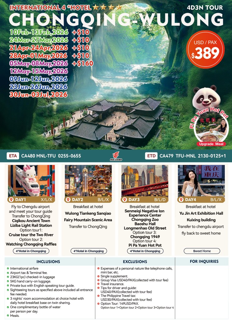 4d/3n CHONGQING-WULONG TOUR 2026 If you are interested to join this tour, please fill in your details below: ← BackThank you for your interest! A member of our team will get in touch with you. Name:(required) Email Address:(required) Mobile Number:(required) SendSubmitting form Δ
