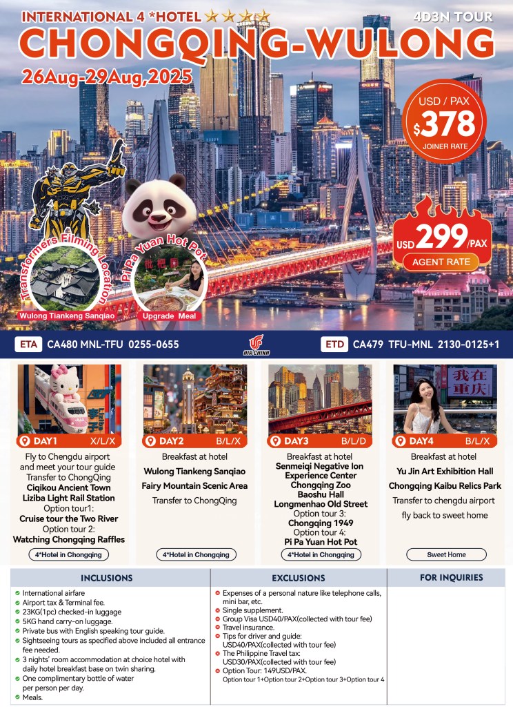 4d/3n CHONGQING – WULONG TOUR |AUG2025| If you are interested to join this tour, please fill in your details below: Go backThank you for your interest! A member of our team will get in touch with you. Name:(required) Warning Email Address:(required) Warning Mobile Number:(required) Warning Warning. SendSubmitting form Δ