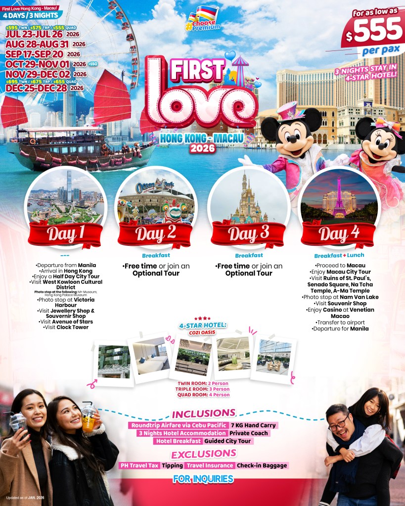 4d/3n – FIRST LOVE HONGKONG-MACAU TOUR 2026 If you are interested to join this tour, please fill in your details below: ← BackThank you for your interest! A member of our team will get in touch with you. Name(required) Email Address(required) Mobile Number(required) SendSubmitting form Δ