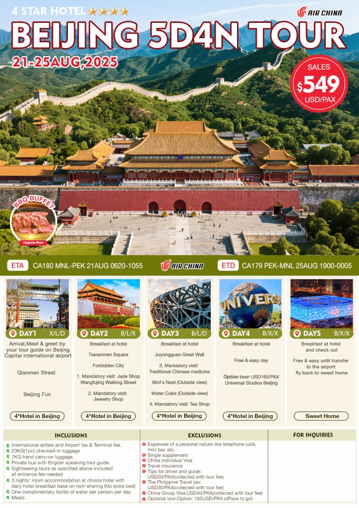 5d/4n BEIJING TOUR AUG 2025 If you are interested to join this tour, please fill in your details below: Go backThank you for your interest! A member of our team will get in touch with you. Name:(required) Warning Email Address:(required) Warning Mobile Number:(required) Warning Warning. SendSubmitting form Δ