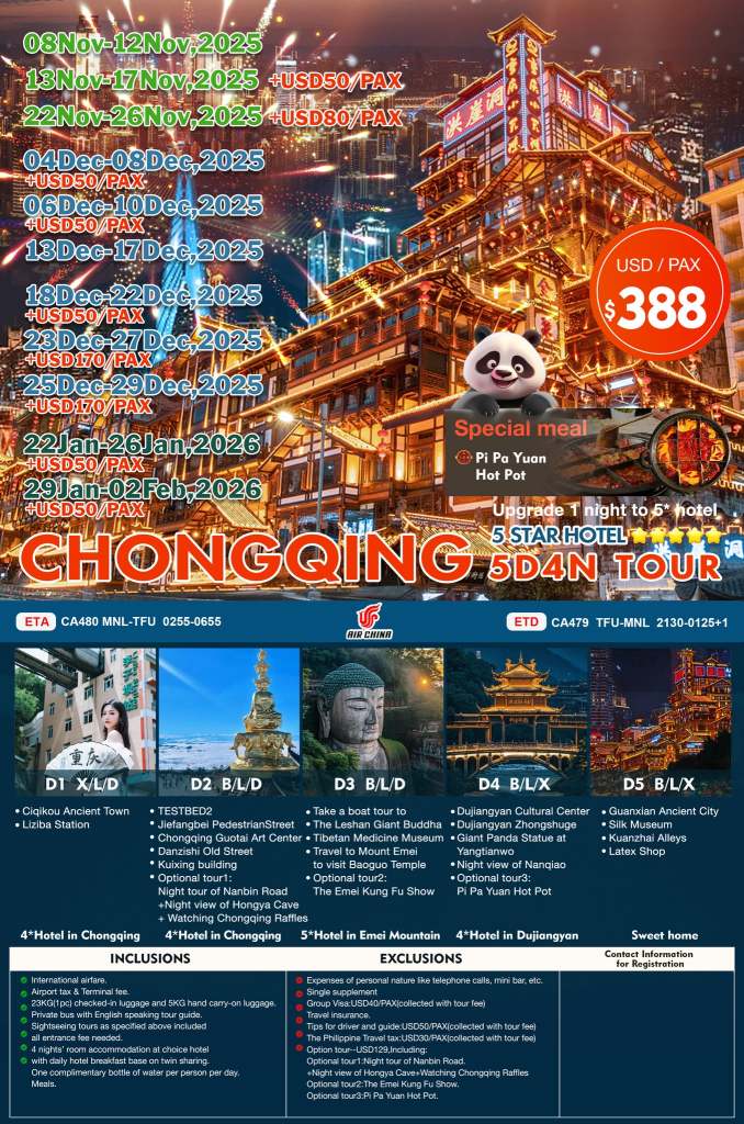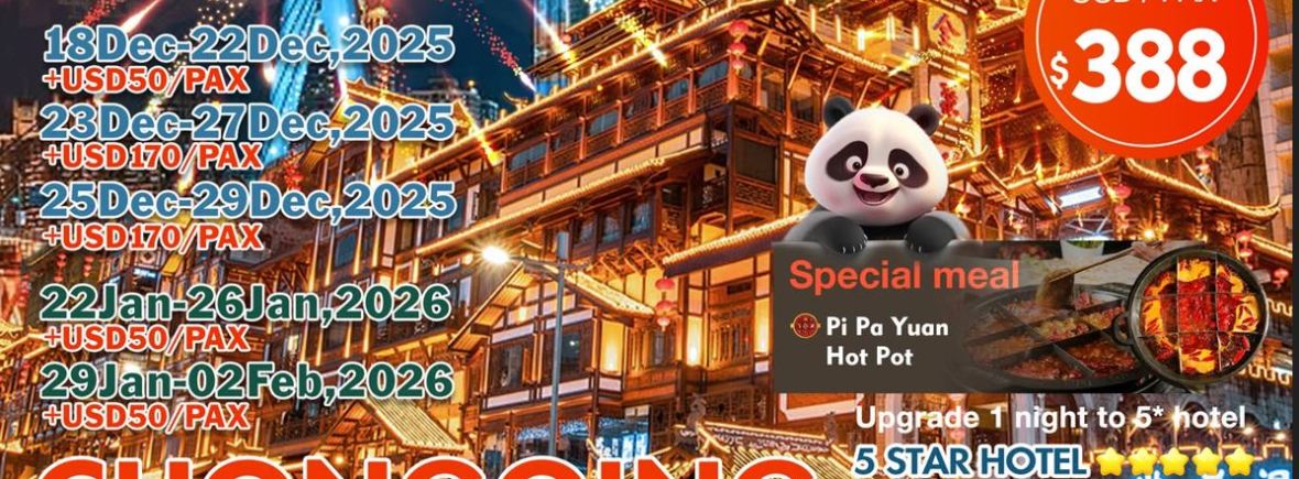 5d/4n CHONGQING TOUR NOV2025|FEB2026 If you are interested to join this tour, please fill in your details below: Go backThank you for your interest! A member of our team will get in touch with you. Name(required) Warning Email Address(required) Warning Mobile Number(required) Warning Warning. SendSubmitting form Δ