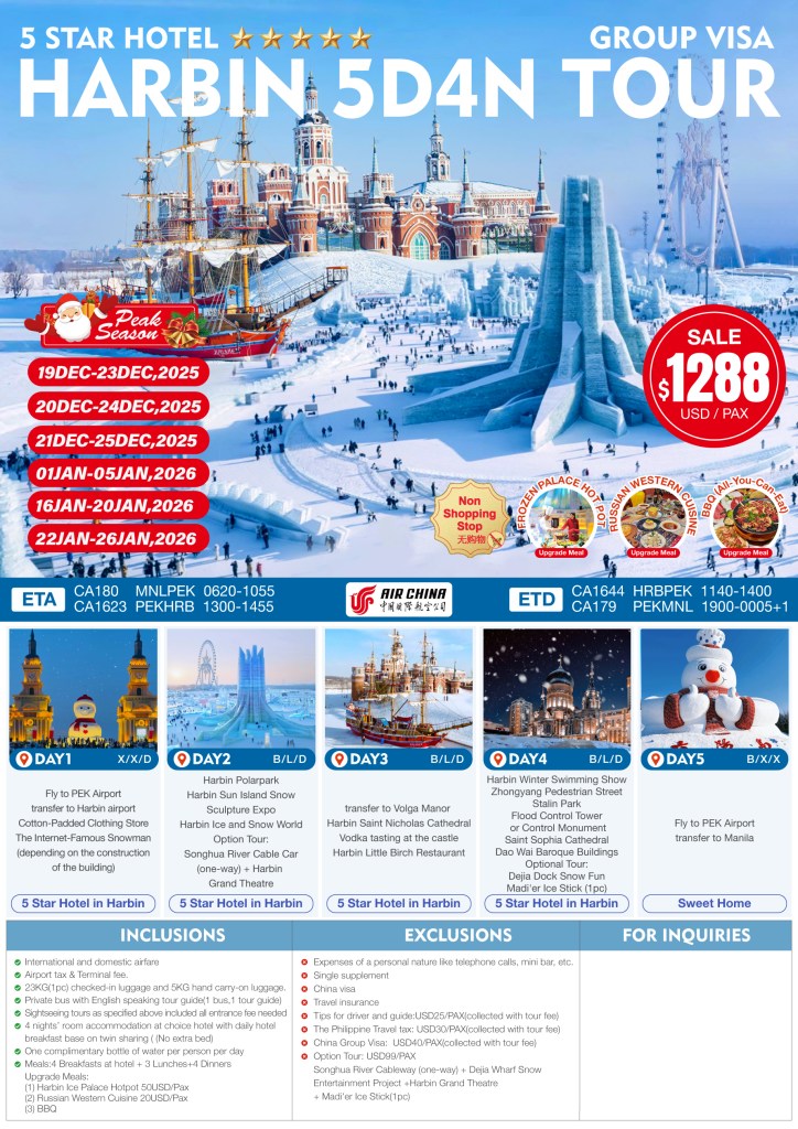 5d/4n HARBIN TOUR 2025-2026 If you are interested to join this tour, please fill in your details below: ← BackThank you for your interest! A member of our team will get in touch with you. Name:(required) Email Address:(required) Mobile Number:(required) SendSubmitting form Δ