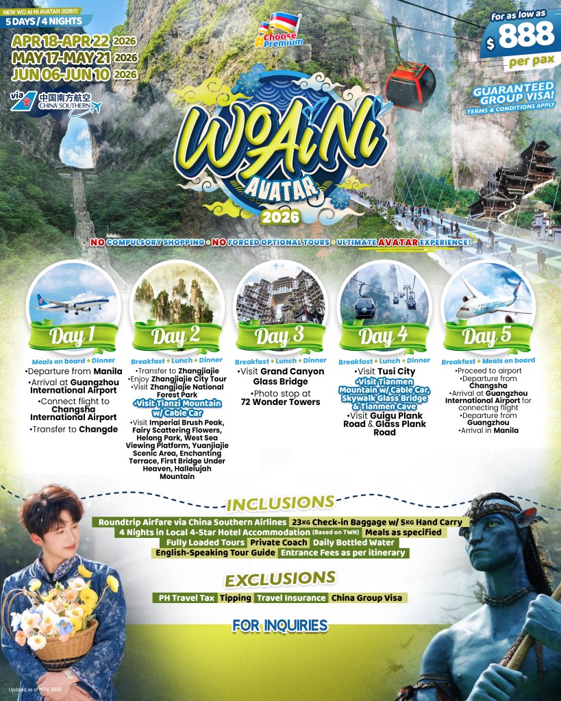 5d/4n NEW WO AI NI AVATAR 2026! If you are interested to join this tour, please fill in your details below: ← BackThank you for your interest! A member of our team will get in touch with you. Name(required) Email Address(required) Mobile Number(required) SendSubmitting form Δ