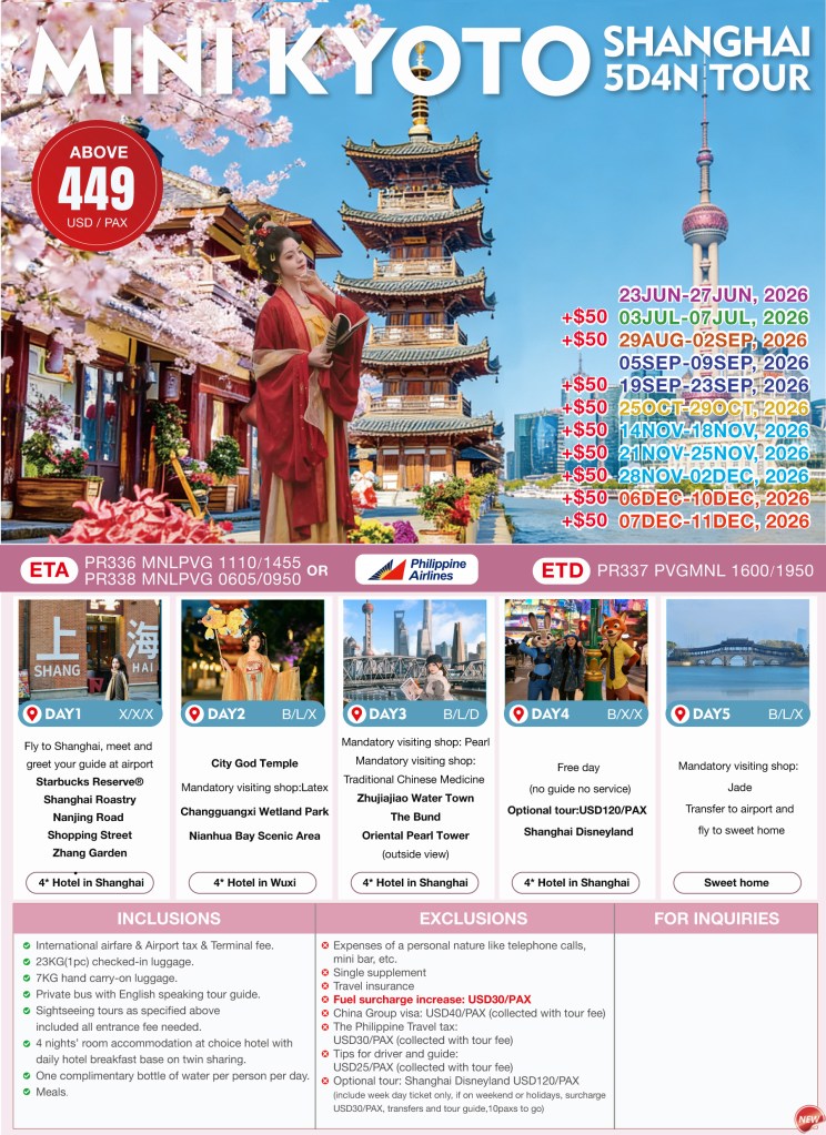 5d/4n Shanghai-Mini Kyoto Tour 2026 If you are interested to join this tour, please fill in your details below: ← BackThank you for your interest! A member of our team will get in touch with you. Name(required) Email Address(required) Mobile Number(required) SendSubmitting form Δ