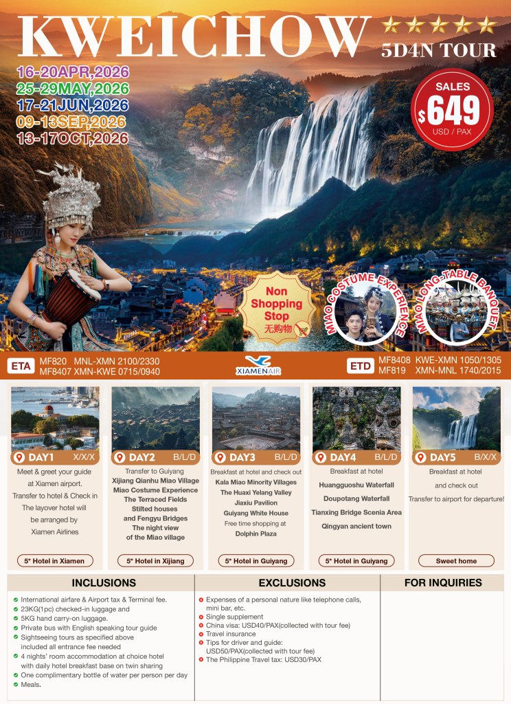 5d/4n KWEICHOW TOUR 2026 If you are interested to join this tour, please fill in your details below: ← BackThank you for your interest! A member of our team will get in touch with you. Name(required) Email Address(required) Mobile Number(required) SendSubmitting form Δ