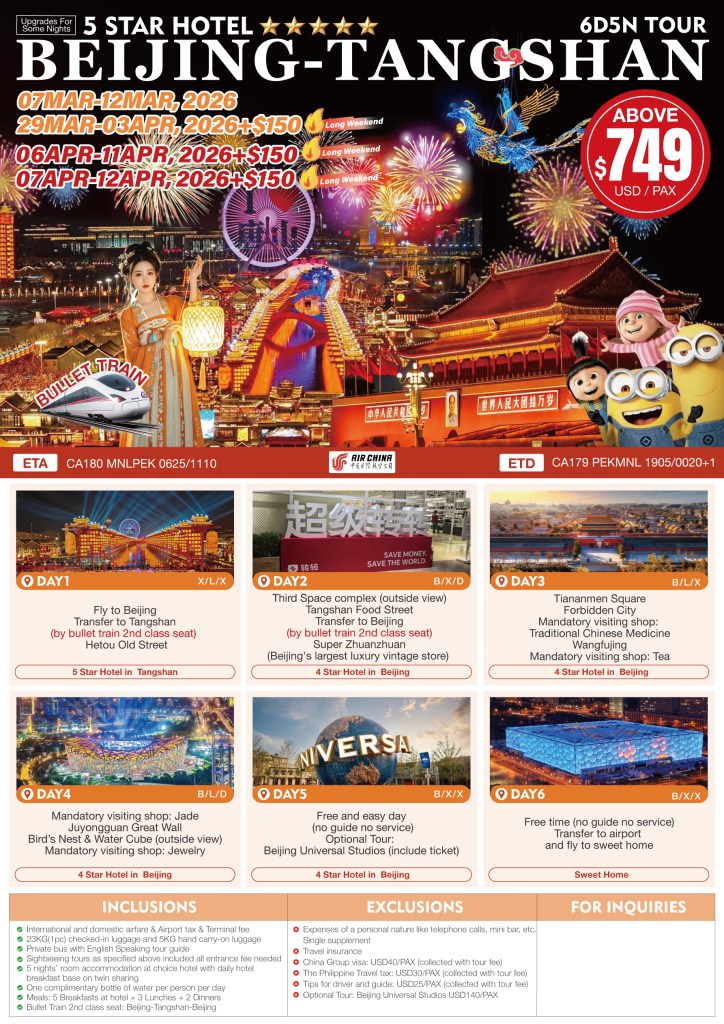 6d/5n BEIJING-TANGSHAN |MAR-APR 2026 If you are interested to join this tour, please fill in your details below: ← BackThank you for your interest! A member of our team will get in touch with you. Name(required) Email Address(required) Mobile Number(required) SendSubmitting form Δ