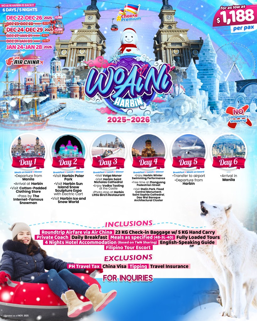 6d/5n WO AI NI HARBIN IS BACK!!! 2025 – 2026 If you are interested to join this tour, please fill in your details below: ← BackThank you for your interest! A member of our team will get in touch with you. Name:(required) Email Address:(required) Mobile Number:(required) SendSubmitting form Δ