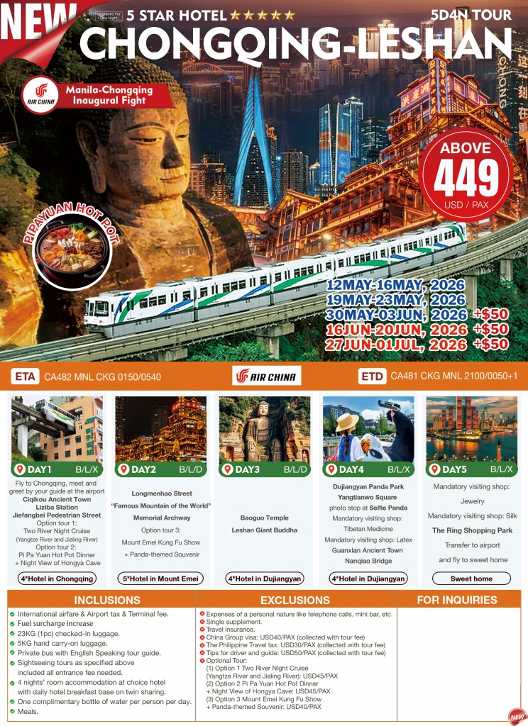 CHONGQING-LESHAN 5D4N TOUR 2026 If you are interested to join this tour, please fill in your details below: ← BackThank you for your interest! A member of our team will get in touch with you. Name(required) Email Address(required) Mobile Number(required) SendSubmitting form Δ