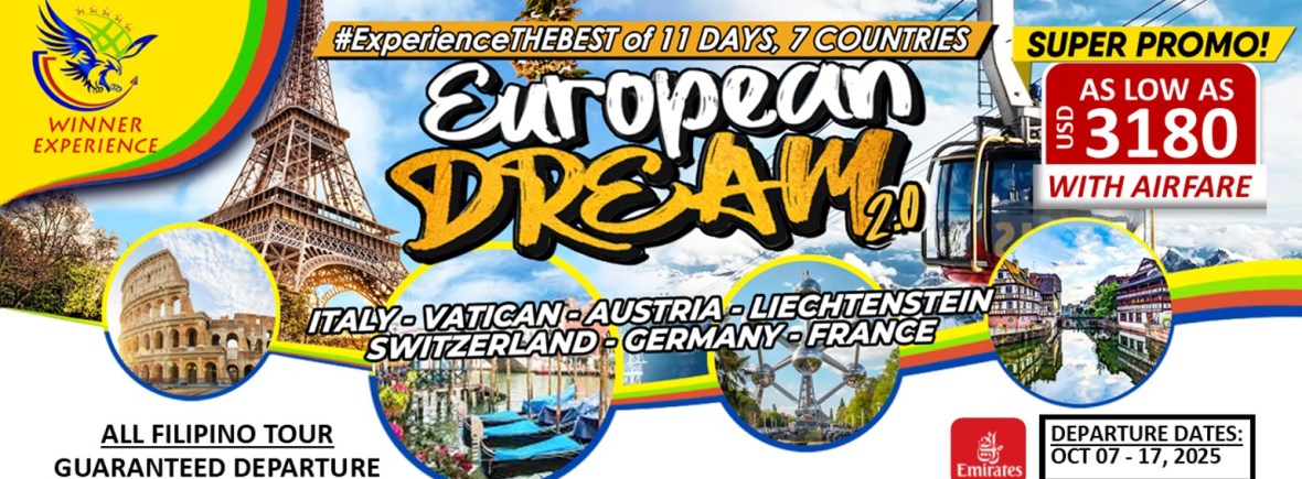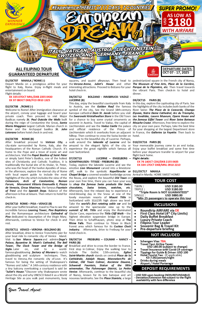 10d/9n EUROPEAN DREAM TOUR 2.0 via Emirates |OCT 2025| If you are interested to join this tour, please fill in your details below: Go backThank you for your interest! A member of our team will get in touch with you. Name(required) Warning Email Address(required) Warning Mobile Number(required) Warning Warning. SendSubmitting form Δ