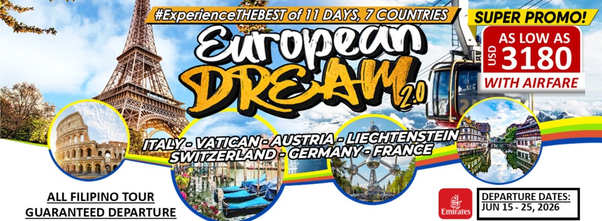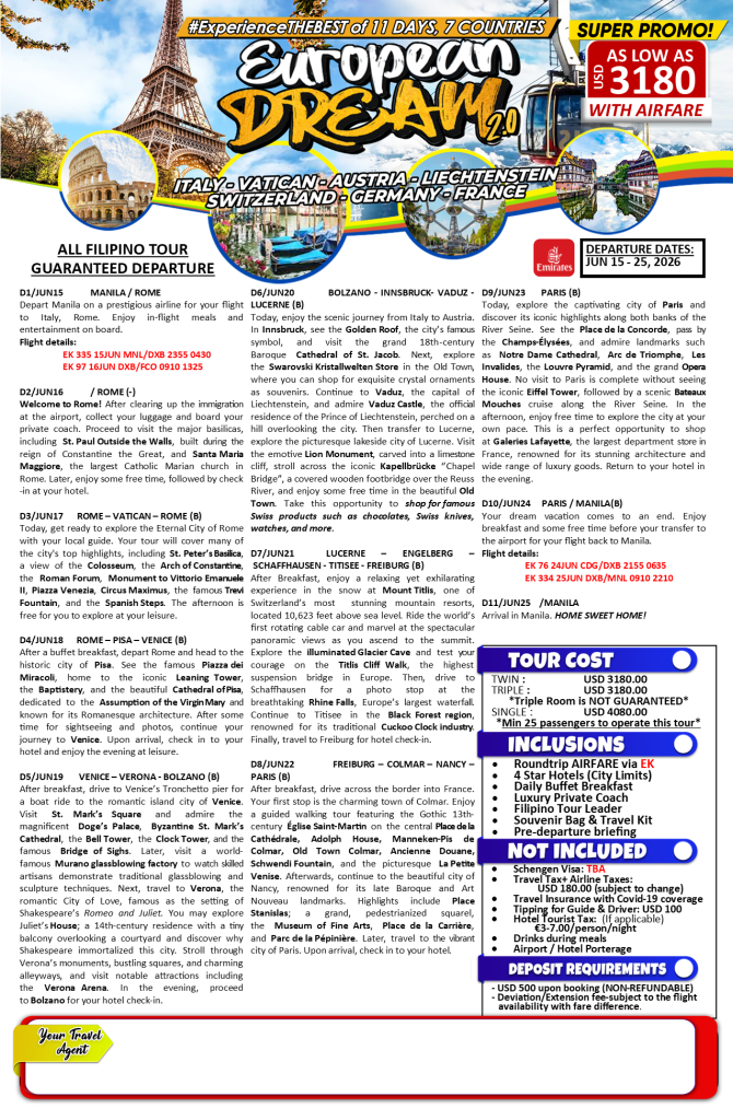 11d/10n EUROPEAN DREAM TOUR 2.0 via Emirates |JUN 2026| If you are interested to join this tour, please fill in your details below: ← BackThank you for your interest! A member of our team will get in touch with you. Name(required) Email Address(required) Mobile Number(required) SendSubmitting form Δ
