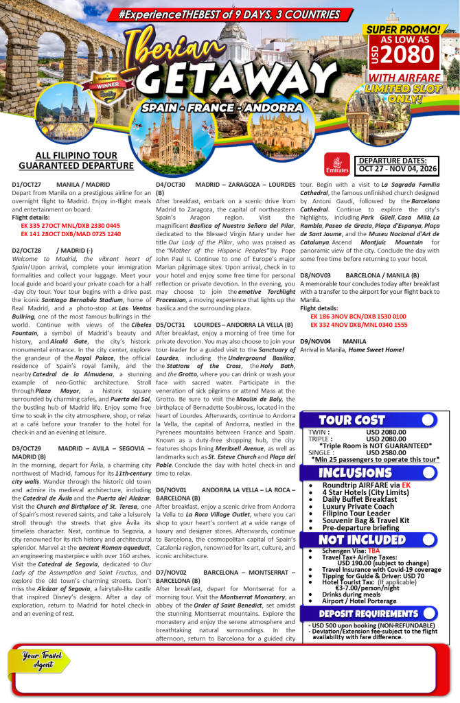 10d/9n Iberian Getaway OCT-NOV 2026 If you are interested to join this tour, please fill in your details below: ← BackThank you for your interest! A member of our team will get in touch with you. Name(required) Email Address(required) Mobile Number(required) SendSubmitting form Δ
