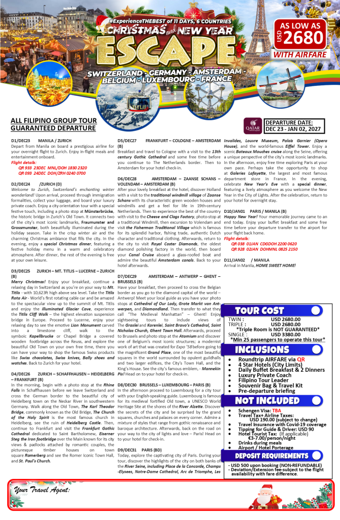 11d/10n Christmas & New Year Escape (Switzerland-Germany-Amsterdam-Belgium-luxemburg-france) 2026 If you are interested to join this tour, please fill in your details below: ← BackThank you for your interest! A member of our team will get in touch with you. Name(required) Email Address(required) Mobile Number(required) SendSubmitting form Δ