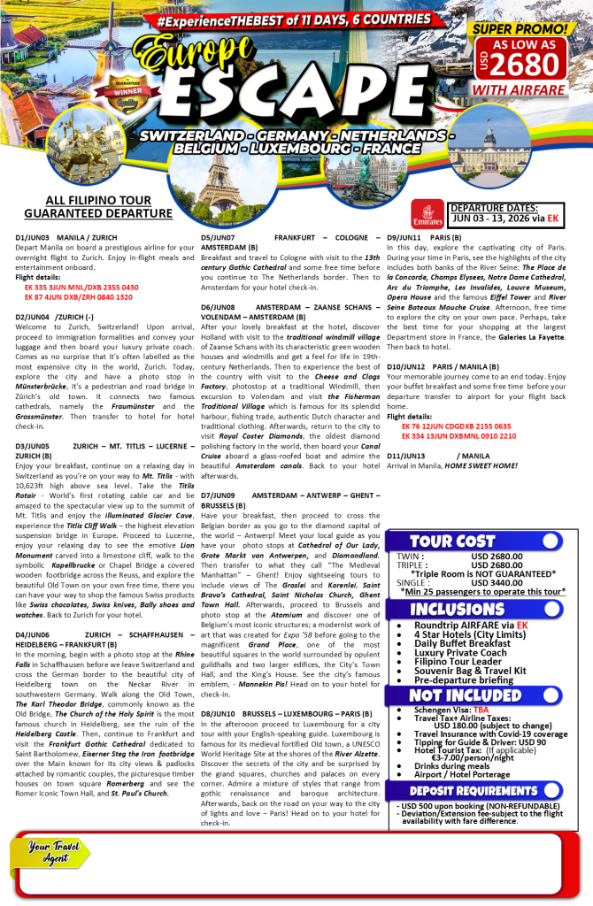 11d/10n EUROPE ESCAPE TOUR JUN 2026 If you are interested to join this tour, please fill in your details below: ← BackThank you for your interest! A member of our team will get in touch with you. Name(required) Email Address(required) Mobile Number(required) SendSubmitting form Δ