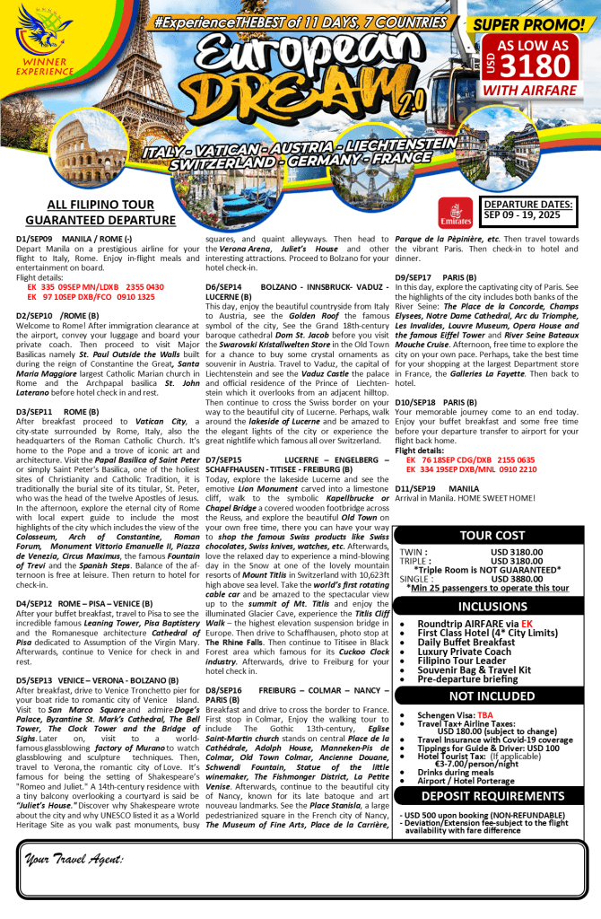 11d/10n EUROPEAN DREAM TOUR 2.0 |SEP 2025| If you are interested to join this tour, please fill in your details below: Go backThank you for your interest! A member of our team will get in touch with you. Name(required) Warning Email Address(required) Warning Mobile Number(required) Warning Warning. SendSubmitting form Δ