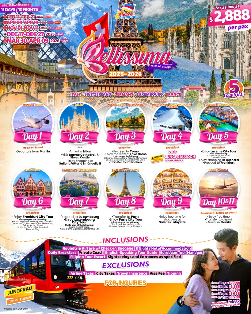 11d/10n BELLISSIMA EUROPE TOUR 2026 If you are interested to join this tour, please fill in your details below: ← BackThank you for your interest! A member of our team will get in touch with you. Name(required) Email Address(required) Mobile Number(required) SendSubmitting form Δ