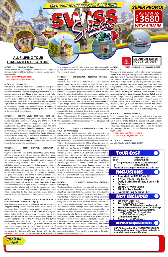 11d/10n SWISS SPLENDOURS with ITALY |NOV 2026| If you are interested to join this tour, please fill in your details below: ← BackThank you for your interest! A member of our team will get in touch with you. Name(required) Email Address(required) Mobile Number(required) SendSubmitting form Δ