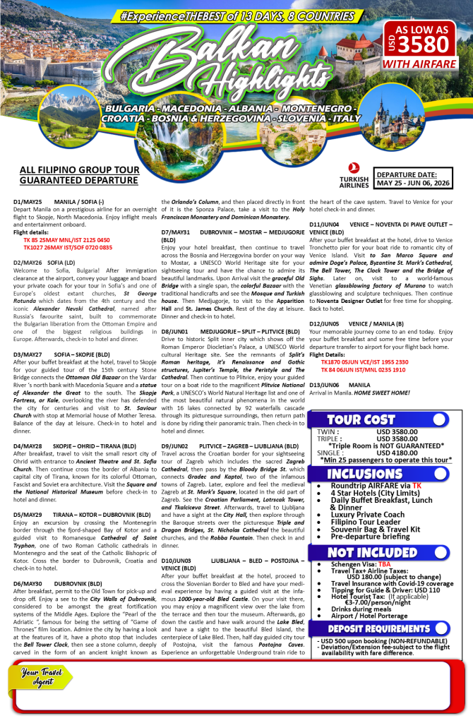 12D/11N BALKAN HIGHLIGHTS 2026 If you are interested to join this tour, please fill in your details below: ← BackThank you for your interest! A member of our team will get in touch with you. Name(required) Email Address(required) Mobile Number(required) SendSubmitting form Δ
