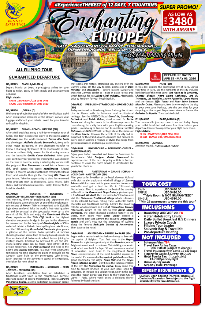 12d/11n ENCHANTING EUROPE TOUR 2026 If you are interested to join this tour, please fill in your details below: ← BackThank you for your interest! A member of our team will get in touch with you. Name(required) Email Address(required) Mobile Number(required) SendSubmitting form Δ