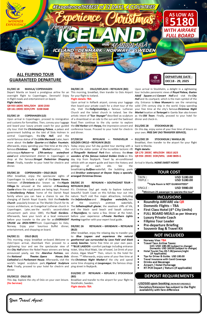 12d/11n Experience in Christmas in AMAZING ICELAND with SCANDINAVIA |DEC 2025| If you are interested to join this tour, please fill in your details below: Go backThank you for your interest! A member of our team will get in touch with you. Name(required) Warning Email Address(required) Warning Mobile Number(required) Warning Warning. SendSubmitting form Δ