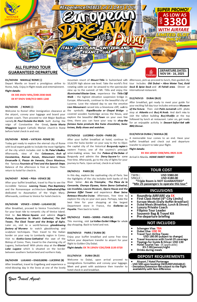13d/12n EUROPEAN DREAM with DUBAI TOUR |NOV 2025| If you are interested to join this tour, please fill in your details below: Go backThank you for your interest! A member of our team will get in touch with you. Name(required) Warning Email Address(required) Warning Mobile Number(required) Warning Warning. SendSubmitting form Δ