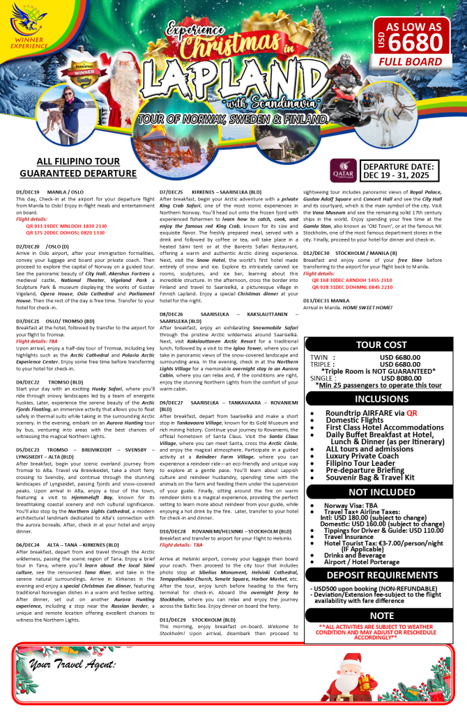 13d/12n Experience Christmas in LAPLAND with SCANDINAVIA |DEC 2025| If you are interested to join this tour, please fill in your details below: Go backThank you for your interest! A member of our team will get in touch with you. Name(required) Warning Email Address(required) Warning Mobile Number(required) Warning Warning. SendSubmitting form Δ